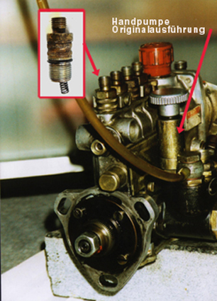 Ein weiterer Test, ob Sprit bis in die Einspritzpumpe kommt: Auf der Einspritzpumpe sitzt das Überstromventil (zwischen dem roten Öldeckel und der letzten Leitung zu den Düsen). Dieses ganz herausdrehen. Wenn dort beim Starten Sprit kommt, ist die Anlage bis vor die Einspritzpumpe in Ordnung.