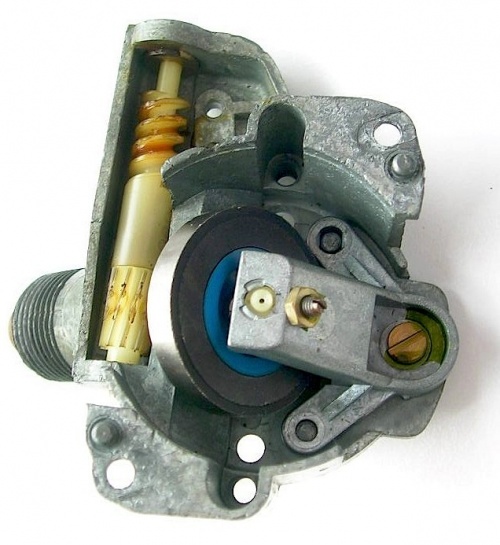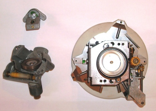 Wenn die Teile montiert sind, drückt die rechts oben mit "A" markierte kleine Platte auf die Mitte der Schwungscheibe beim links abgebildeten Bauteil (ebenfalls mit "A" markiert).