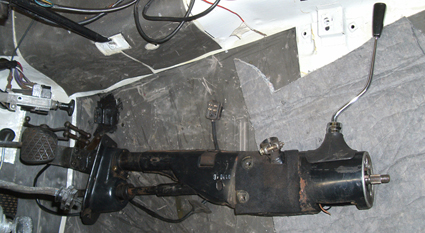 - Jetzt beginnt ein großes Geduldspiel, wofür ein Helfer brauchbar sein dürfte: der Einbau der Säule. Ich habe es alleine gemacht und das OHNE die ganze Umlenkerei abzubauen. Ich hatte einfach keine Lust, sie in diesen beengten Verhältnissen zwischen Spritzwand und Motor anbauen zu müssen. Es geht mit viel Geduld (auch mit Bremspedal). Dazu muss die Säule aber von Anfang an rechts oberhalb des Bremspedalgummis gehalten werden, sonst bekommt man die Säule nicht mehr dran vorbei geschwenkt, wenn alles hinten im Loch ist (ratet mal woher ich das weiß...)! Der Schalthebel sollte aber ab sein, der stört nur. Der Helfer sollte unterm Auto sein und von außen bei der Fädelei helfen (auch hier macht sich eine Grube besser). Und noch mal, das passt! Nicht verzweifeln!