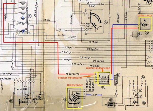 Der folgende Schaltbildauszug zeigt die Zuführung der +12 Volt Stromversorgung von der Sicherung 6 bis zum Lüftermotor (in rot) und den „Rücklauf“ des Stroms vom Lüftermotor über die Widerstandsgruppe im Blechkäfig und den Stecker Motorwand zum Drehschalter im Armaturenbrett und auf Masse (in blau).