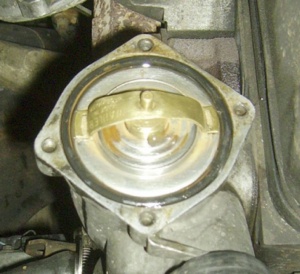 • Bei klemmendem Thermostat diesen ganz ausbauen und den Thermostatdeckel wieder zuschrauben. (Die Thermostatschrauben sind leider mitunter festgefressen). Das Kühlsystem läuft dann „kälter“, weil immer voller Durchfluss herrscht. Die Motorerwärmung dauert bei kaltem Motor viel länger und erreicht je nach Außentemperatur und Fahrweise nicht die reguläre Betriebstemperatur.