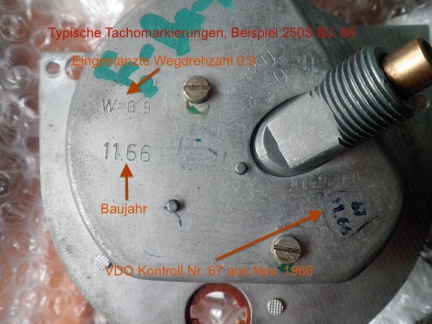 Die Wegdrehzahl findet man auf der Rückseite des Tachos; siehe Foto 1 (von Kollegen "movie 280 C") und Foto 2 (von Kollegen "Birgit Kraft"):