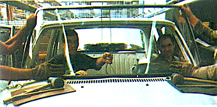 Die Frontscheibe zu wechseln ist nicht ganz trivial – und alleine nicht zu bewältigen wie schon ein Foto aus der damaligen Produktion der Autos zeigt: