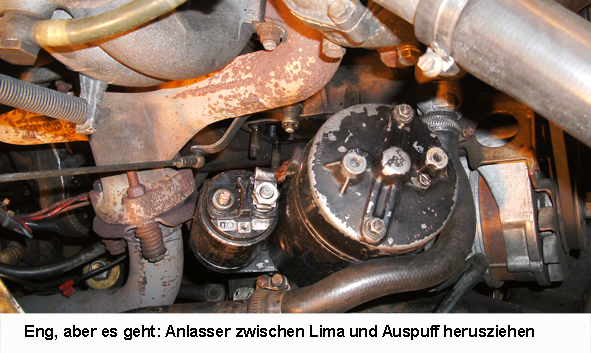 - Jetzt (endlich) kann der Anlasser zwischen Auspuff und Lima herausgezogen werden. Evtl. muss das an der Seite verlaufende dünne Wasserrohr der Heizung noch an einer Halterung gelöst werden, damit der Platz reicht. Man kann natürlich auch andere Wege suchen, z.B. die Spurstangen öffnen oder den Auspuff demontieren, aber ich denke der Ausbau des Motorhalters ist am praktikabelsten.