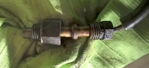 Vorherige Anwendung von Kriechöl hilft beim Lösen der 14-er Überwurfmutter. Hat man die kleine Überwurfmutter gelöst, steckt der Fühler noch im Kopf.