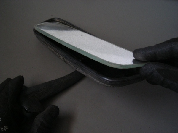 Der erwärmte Plastikrahmen ließ sich jetzt mit der Hand wegdrücken und erlaubte so, das Spiegelglas vorsichtig herauszunehmen. Ich habe kein Werkzeug benutzt. Es ging alles mit den Fingern.