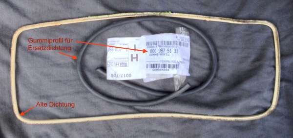 Das Gummiprofil ist eine Moosgummi-Rundschnur mit 6 mm Durchmesser. Es gibt sie auch preiswert z.B. in EBAY; einfach Suchfunktion "Rundschnur Moosgummi" verwenden. Alt und neu sieht dann so aus (wobei das kurze schwarze Stück ein Reststück nach dem Zuschneiden ist):