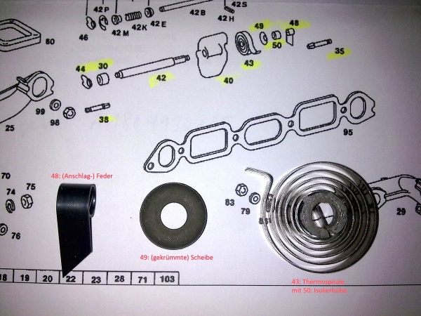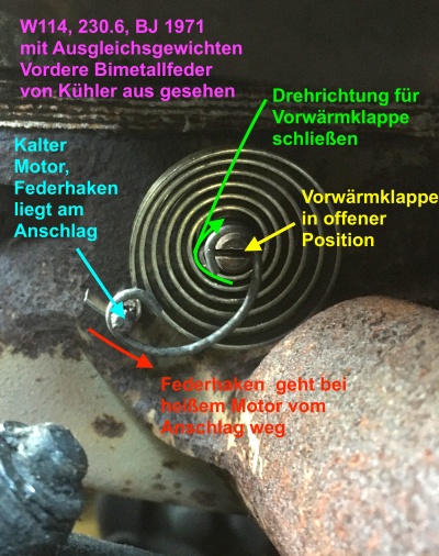 Die Bimetallfeder muss bei geöffneter Heizklappe mit ca. 75 - 90° Vorspannung eingebaut werden. So steht es im Werkstatthandbuch für den M115.