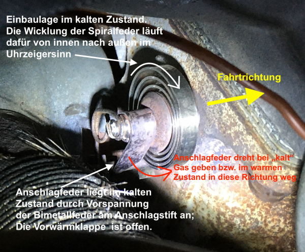 Im kalten Zustand hält die Bimetallfeder die Vorwärmklappe offen für die Saugrohrbeheizung. Dabei liegt auch die Anschlagfeder an.
