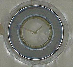 Die erste deckt den äußeren Metallrand ab. Man schneidet das Papier zunächst so zu, daß es den gesamten Raddeckel abdeckt. Sodann schneidet man zentrisch ein kreisförmiges Loch, das einen etwa 3-4 mm größeren Radius hat als die äußerste Lackkante.