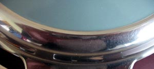 Mit dem FineLine Tape werden nun die Metallkanten abgeklebt. Bei bereits lackierten Deckeln kann man sich leicht an den vorhandenen Lackkanten orientieren, bei unlackierten Deckeln empfiehlt es sich, die Kehlen mit dem Zirkel vorsichtig anzureißen, da man sonst garantiert keine gleichmäßigen Rundungen hinbekommt. Abkleben und Lackieren des Außenkreises Man beginnt mit der äußersten Kante und klebt zunächst eine Bahn rundherum entlang der Lackkante bzw. des Anrisses. Anschließend setzt man parallel eine weitere Bahn außen an. Auf diesen breiten Streifen kann man nun die Außenschablone problemlos mit Tesakrepp befestigen.