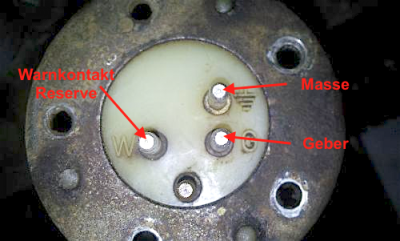 Die Lampe der Reserveanzeige wird bei Tankinhalt unter ca. 10 Liter über einen Kontakt im Tankgeber geschaltet, wenn der Schwimmer unten ist, Pin 3 (W). Der Schwimmer muss sich also bewegen können und beide Kontakte (Schwimmer und der Reservekontakt im Schwimmer) müssen blank sein. Hier noch ein Prinzipschaltbild (vom Kollegen T-Modell):