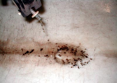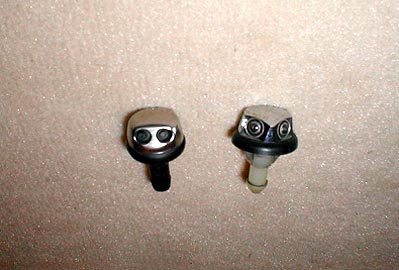 Nun die Leitungen von den Düsen unter der Motorhaube abziehen und die Düsen vorsichtig, durch Zusammendrücken der Klemmarretierung, von unten aus der Motorhaube rausdrücken. Zum Lösen kann man eine kleine Zange zur Hand nehmen, wenn sie zu fest sitzen. Die Löcher in der Motorhaube evtl. gleich mit Lackreiniger von Schmutzrändern befreien und vorsorglich auf jeden Fall von oben und unten mit Wachs einstreichen, damit bei evtl. abplatzendem Lack beim Montieren der Düsen später keine Korrosion entstehen kann. Jetzt die Düsen selber reinigen. Es gibt spezielle Düsen-Feilen – die sind in verschiedenen Größen im Satz für unter 10,- € in jedem Autozubehörhandel zu erwerben. Besser ist es aber noch die Düsen zusätzlich über Nacht in Essigwasser zu legen, damit sich alle Kalkablagerungen lösen können. Die Löcher, aus denen das Wasser kommt, sind in einer kleinen Kugel und mit einer Nadel einstellbar - somit kommt dann der Strahl dort auf die Scheibe, wo er auch Sinn macht. Nach gründlicher Reinigung und durchpusten mit Druckluft, können die Düsen vorsichtig wieder in die Löcher Motorhaube gedrückt werden. Eventuell vorhandene Wachsrückstände auf der Haube jetzt wieder weg wischen.
