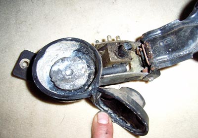 Zum Ausbau der Pumpe die untere Armaturenbrettverkleidung vorsichtig ausbauen - auch die Fußmatte muss herausgenommen werden. Dann die beiden Schrauben, mit denen die Pumpe an der Spritzwand befestigt ist, lösen. Zuerst den Stecker vom Gehäuse der Pumpe abnehmen (falls er zu fest sitzen sollte, vorsichtig mit einem kl. Schraubenzieher abhebeln) und dann den Schlauch von dem im Gummibalg steckenden Adapter/Kunststoffröhrchen abziehen. Vorsicht: Am besten ein leeres Glas mit in den Fußraum nehmen, um das sich noch im Schlauch befindliche Wasser aufzufangen. Jetzt die Pumpe - sinnvollerweise am Waschbecken - zusammendrücken und entleeren. Dabei kommen meistens schon die ersten Verunreinigungen zu Tage.